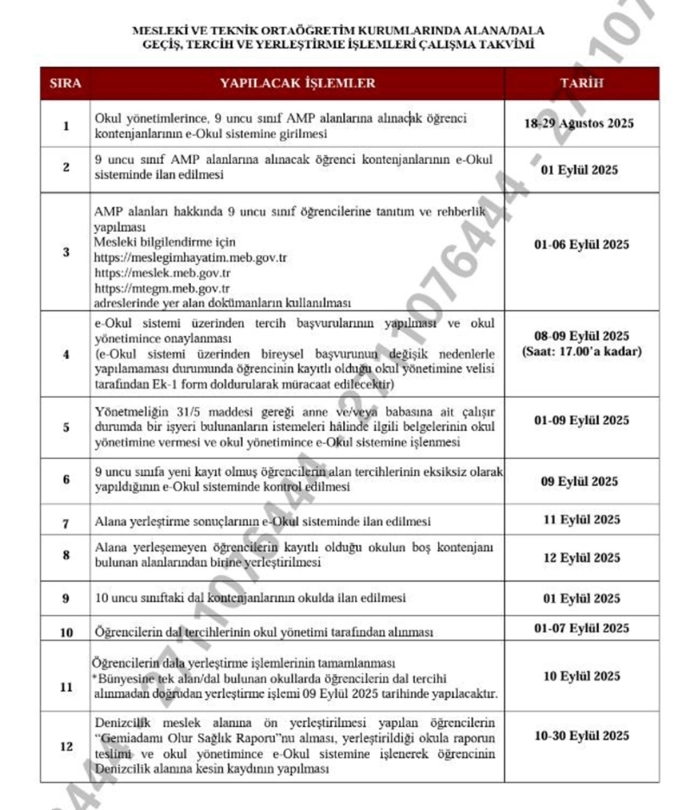 AMP meslek alanlarına yerleştirme sonuçları, https://e-okul.meb.gov.tr adresindeki Veli Bilgilendirme Sistemi üzerinden duyurulacak. Okul yönetimleri, öğrencilerin elektronik işlemlerini kolaylaştırmak için en az bir müdür yardımcısı görevlendirecek. e-Okul sisteminde yapılan tercihlere okul yönetimi, veli veya öğrenci rapor olarak erişebilecek.