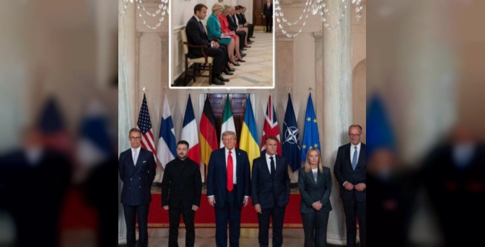 Rusya-Ukrayna Savaşı'nı sona erdirip erdirmeyeceği tartışılan kritik zirve sonrası, sosyal medyada dolaşan bir fotoğraf soru işaretleri yarattı. Görselde, Fransa Cumhurbaşkanı Emmanuel Macron ve altı Avrupalı lider, koridorda Trump'ı beklerken yan yana oturuyor.