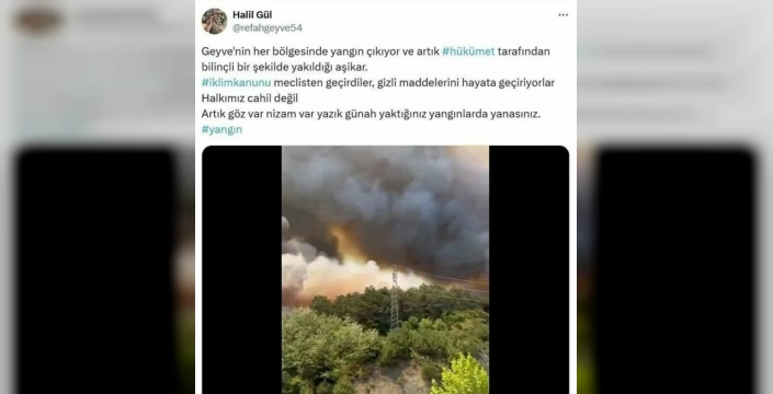 Geyve Belediyesi'nin Yeniden Refah Partili Meclis Üyesi Halil Gül, sosyal medya hesabından yaptığı paylaşımda yangınların hükümet tarafından kasıtlı olarak çıkarıldığını iddia etmiştir. Gül'ün bu paylaşımı, kamuoyunda büyük tepki toplamış ve soruşturma başlatılmasına neden olmuştur. Bu tür sorumsuz açıklamaların, zaten zorlu bir süreçten geçen milletimizi daha da yıpratabileceğini ve toplumsal huzurumuzu bozabileceğini hatırlatmak isteriz.