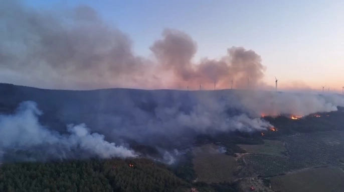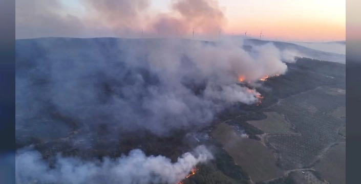 Tekirdağ'ın Şarköy ilçesinde dün öğleden sonra başlayan ve sabaha kadar süren orman yangını, büyük bir alanı etkisi altına aldı. Rüzgarın etkisiyle hızla yayılan yangın, gece boyunca itfaiye ekipleri ve iş makineleriyle müdahale edilmesine rağmen kontrol altına alınamadı. Ekiplerin gece boyunca yoğun çaba sarf ettiği ve yorgun düştüğü anlar da gözlendi.