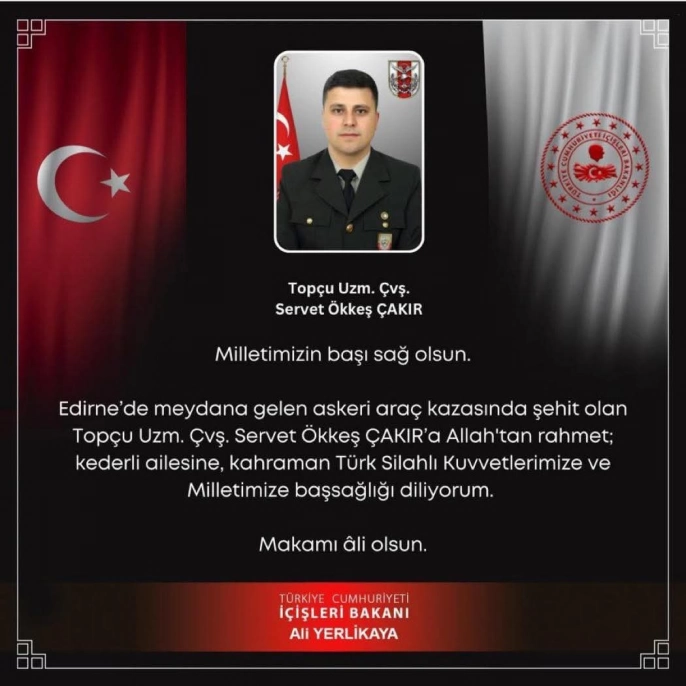 Milletimizin başı sağ olsun! Edirne’nin Uzunköprü ilçesinde görev yapan kahraman Topçu Uzman Çavuş Servet Ökkeş Çakır, görevini yerine getirirken geçirdiği elim bir kaza sonucu şehit oldu. Bu acı kayıp, tüm Türkiye’yi yasa boğdu. Vatan savunmasında canını feda eden aziz şehidimize Allah’tan rahmet, ailesine ve milletimize başsağlığı diliyoruz.