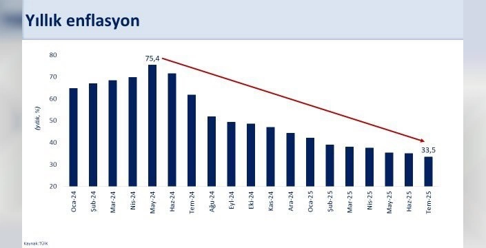 Şimşek, açıklamasında aylık enflasyonun Temmuz ayında geçici ve dönemsel etkilerle yüzde 2,06 olduğunu, yıllık enflasyonun ise son 12 ayda 28,3 puan düşüşle yüzde 33,5'e gerilediğini belirtti. Yıllık gıda enflasyonunun yüzde 28, temel mal enflasyonunun yüzde 20,7 ve hizmet enflasyonunun ise üç yılı aşkın bir sürenin ardından ilk kez yüzde 50'nin altına indiğini açıkladı.