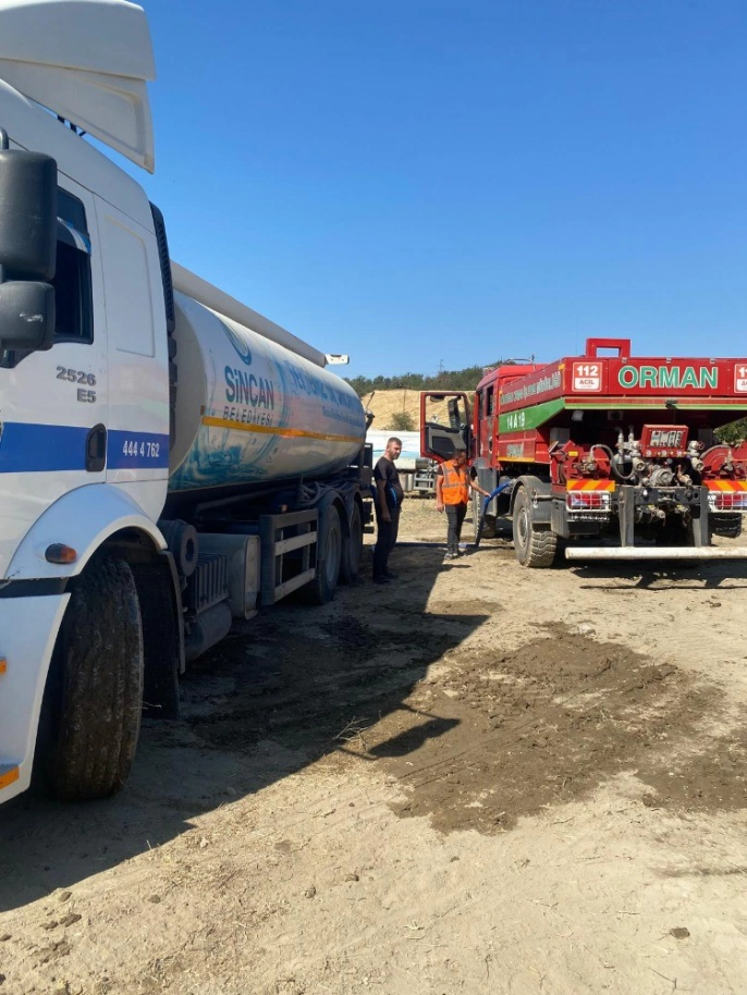 Yangın söndürme çalışmalarının aralıksız sürdüğü Göynük ilçesinde, Sincan Belediyesi'nin gönderdiği su tankerleri, alevlerin kontrol altına alınmasında görevli ekiplere büyük destek oldu. Belediyenin hızlı ve etkili müdahalesi, yangının büyümesini engellemeye yardımcı oldu. Ekipler, yangının tamamen söndürülmesi için çalışmalarına devam ediyor.