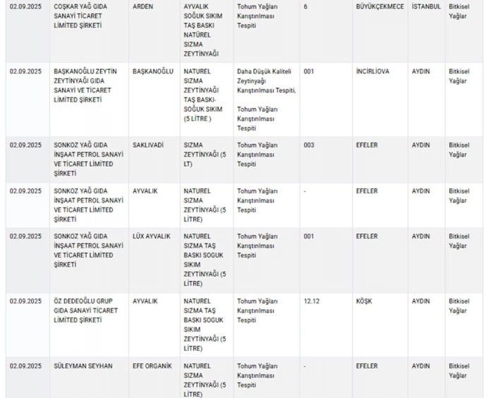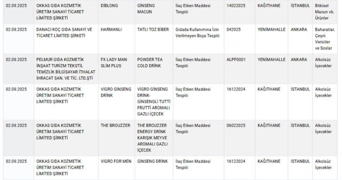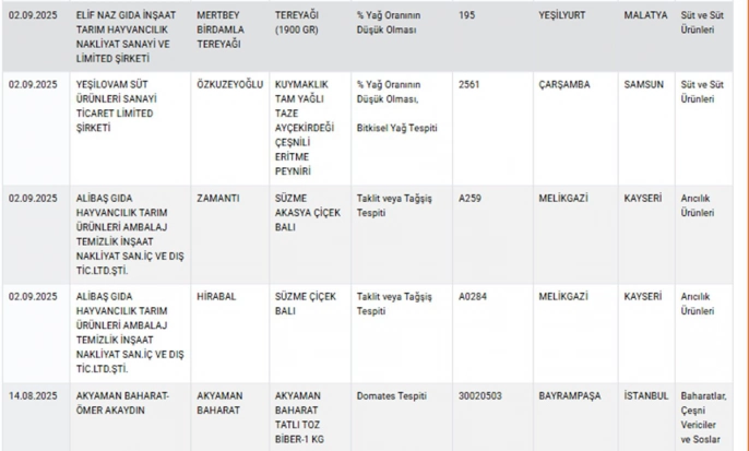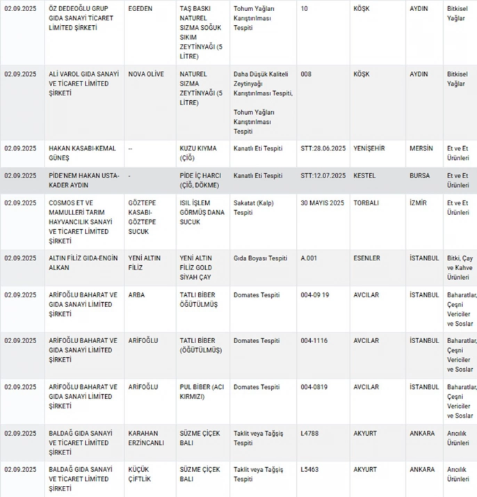 Sağlığı tehlikeye düşürecek gıdalar ve taklit-tağşiş yapılan gıdalar başlıkları altında, sağlığı tehlikeye atan firmalar, markalar ve ürünler listeleniyor. 6'sı sağlığı doğrudan tehdit eden ürün olmak üzere toplamda 28 yeni ürün, mevcut listeye dahil edildi. Listede baldan tereyağına, gazozdan kıymaya kadar çeşitli ürünler yer alıyor.