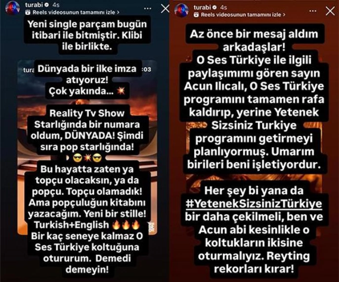 Bir diğer paylaşımında ise Acun Ilıcalı'ya gönderme yapan Çamkıran, Ilıcalı'nın O Ses Türkiye'yi rafa kaldırıp Yetenek Sizsiniz Türkiye'yi yeniden başlatmayı planladığını öğrendiğini belirtti. Çamkıran, Ilıcalı ile birlikte Yetenek Sizsiniz Türkiye programında yer alarak reyting rekorları kırmayı hedeflediğini ifade etti. Bu açıklamalar, hem Turabi Çamkıran'ın kariyer planlarını hem de Acun Ilıcalı'nın gelecek projelerini merak konusu haline getirdi.