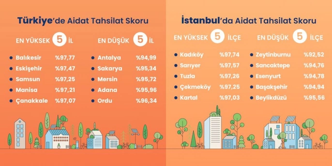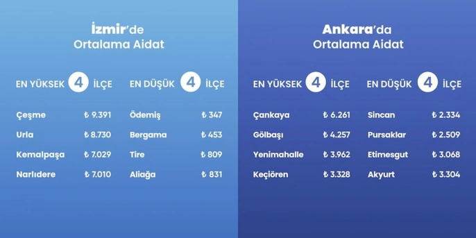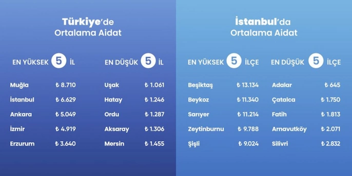 2025 yılında ortalama 8 bin 710 TL'ye ulaşan Muğla, en yüksek ortalama aidata sahip il oldu. Muğla'yı sırasıyla 6 bin 629 TL ile İstanbul, 5 bin 49 TL ile Ankara ve 4 bin 919 TL ile İzmir takip etti. En düşük aidatlar ise Uşak (bin 61 TL), Hatay (bin 246 TL), Ordu (bin 287 TL), Aksaray (bin 306 TL) ve Mersin'de (bin 455 TL) görüldü.