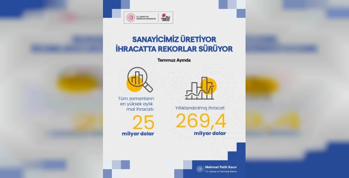 Sanayi ve Teknoloji Bakanı Mehmet Fatih Kacır'ın müjdesi, Türk ekonomisine yeni bir ivme kazandırdı. Temmuz ayı ihracat rakamları, tüm zamanların en yüksek aylık ihracat değerine ulaşarak 25 milyar doları aştı. Bu, geçen yılın aynı ayına göre yüzde 11'lik bir artış anlamına geliyor. Ülkemizin ekonomik gücünü ve istikrarını gösteren bu başarı, Doğu Anadolu Bölgesi'nin de dahil olduğu tüm Türkiye'yi gururlandırdı.
