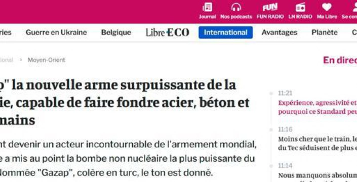 Belçika'nın Fransızca yayın yapan günlük gazetesi La Libre, Türkiye'nin geliştirdiği yeni silahı 'Gazap'ı manşetine taşıdı. Gazete, 'Gazap: Türkiye'nin çelik, beton ve insan kemiğini eritme kapasitesine sahip yeni süper güçlü silahı' başlığını kullanarak, Türkiye'nin küresel silah endüstrisinde önemli bir aktör olmayı hedeflediğini vurguladı. La Libre, 'Gazap'ın, Türkçede 'öfke' anlamına geldiğini ve adıyla bile güçlü bir mesaj verdiğini belirtti.