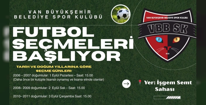 Van Büyükşehir Belediyespor Kulübü, seçmelere katılmak isteyen tüm futbolcuları davet etti. Kulüp yetkilileri, seçmelerin kentteki genç sporcular için önemli bir fırsat olduğunu vurgulayarak, A takım ve altyapıya katılmak isteyenlerin başvuruda bulunabileceğini belirtti. Seçmelere katılacak sporcuların kendi imkanlarıyla başvuruda bulunacakları da kaydedildi. Kulüp, gençlerin spora yönlendirilmesi ve geleceğin başarılı sporcularının yetiştirilmesi amacıyla bu seçmeleri düzenliyor.