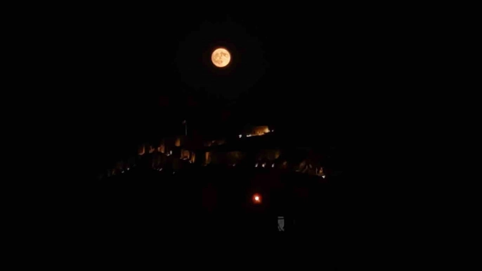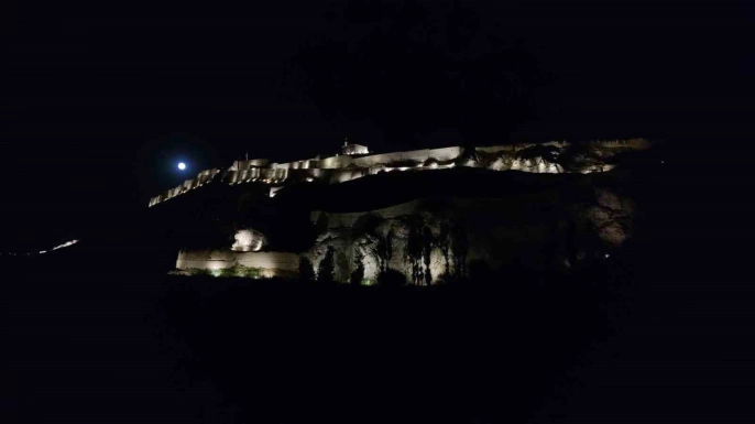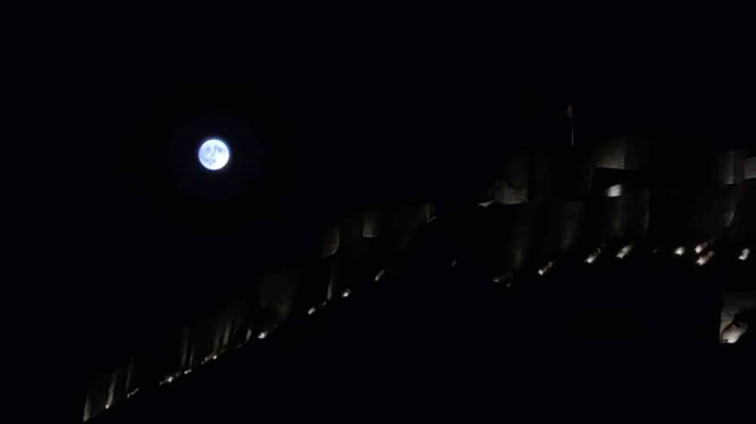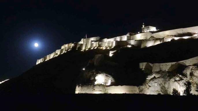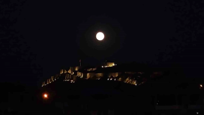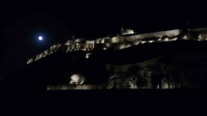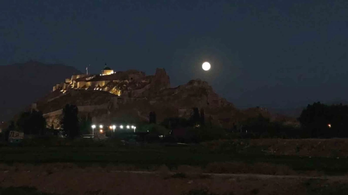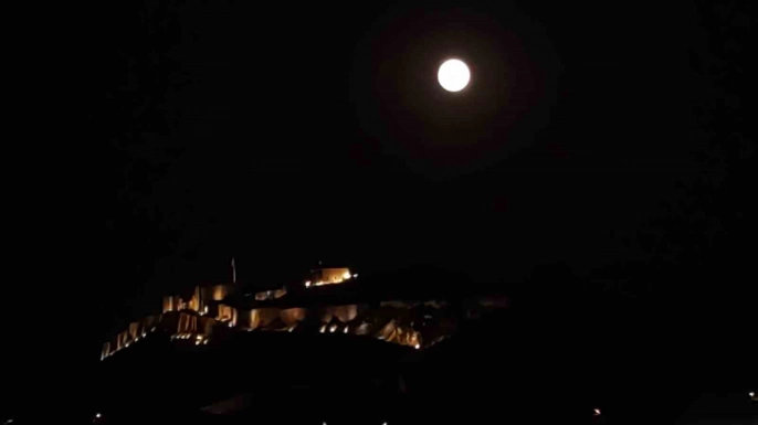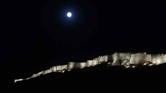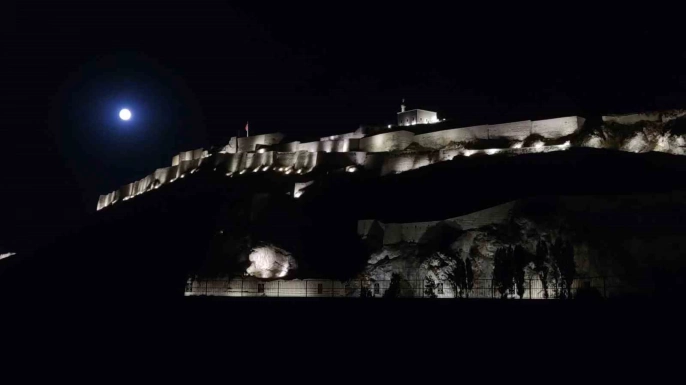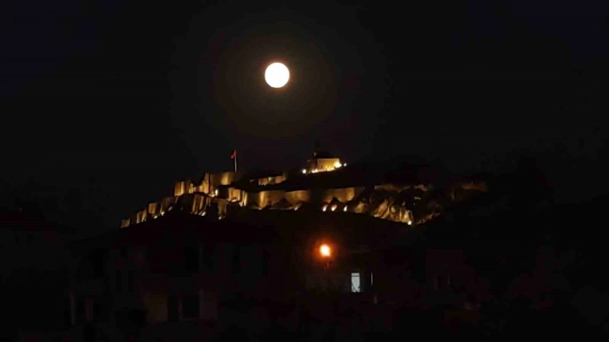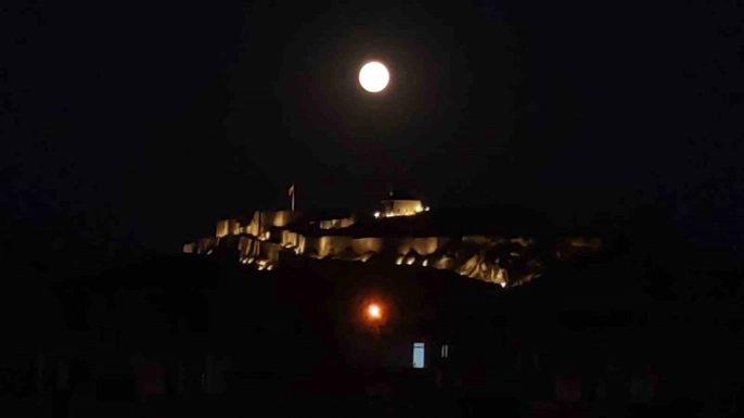 Van semalarında parlayan dolunay, tarihi Van Kalesi ile muhteşem bir manzara oluşturdu. Dolunayın parlaklığı ve Van Kalesi'nin tarihi dokusunun birleşimi, eşsiz bir görsel şölen sunarak adeta kartpostallık görüntüler ortaya çıkardı.