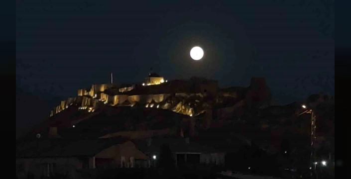 Gökyüzünde tam yuvarlak olarak parlayan dolunay, Van Kalesi'nin siluetiyle bütünleşerek büyüleyici bir atmosfer yarattı. Bu doğa ve tarih buluşması, şehrin birçok noktasından izlendi ve fotoğraf tutkunlarının da büyük ilgisini çekti.