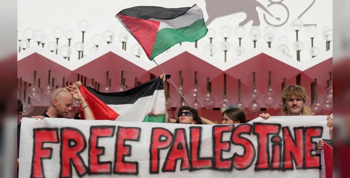 Göstericiler, Venedik Film Festivali'nden kamuoyuna açık bir tavır almasını ve İsrail'in Filistin'de işlediği 'soykırımı' kınamasını talep etti. Filistin bayrakları ve 'Özgür Filistin, soykırımı durdurun' yazılı pankartlar açan göstericiler, Gazze'deki insani krize dikkati çekmek için 'Özgür Filistin' ve 'Nehirden denize özgür Filistin' sloganları attı. Grup sözcülerinin basına yaptığı açıklamada, 30 Ağustos'ta yerel saatle 17.00'de bir protesto gösterisi düzenlemeyi planladıkları belirtildi.